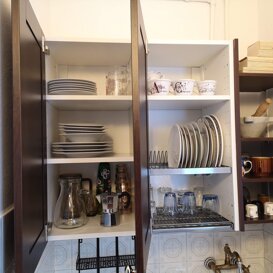 La piccola ma funzionale cucina comprende una piastra a induzione, forno a microonde, bollitore, tostapane, frigorifero con congelatore. E naturalmente le vivande necessarie per la preparazione della colazione.